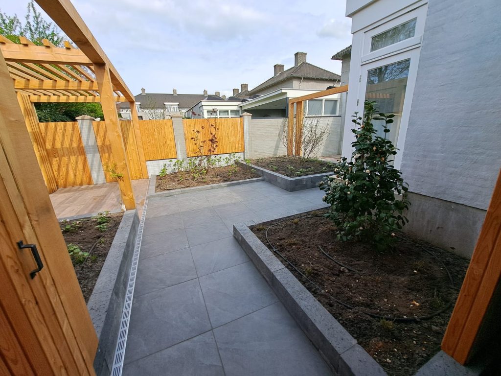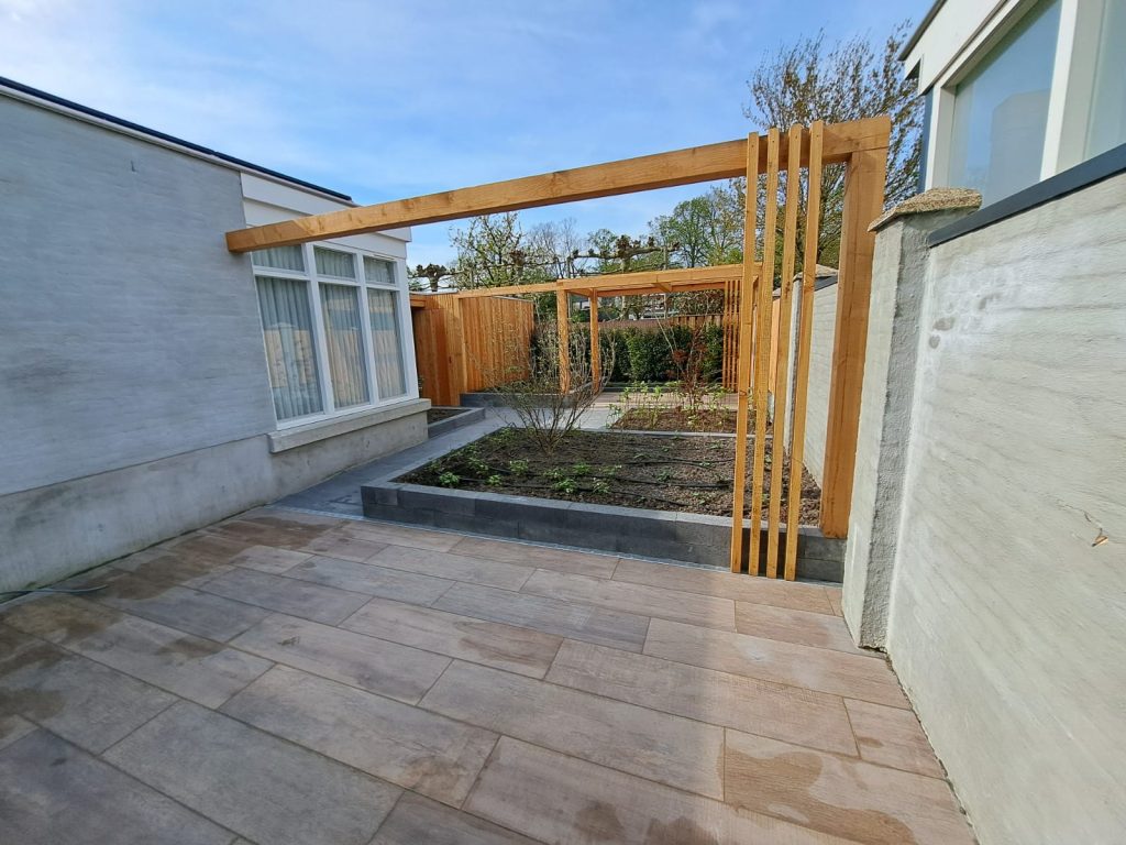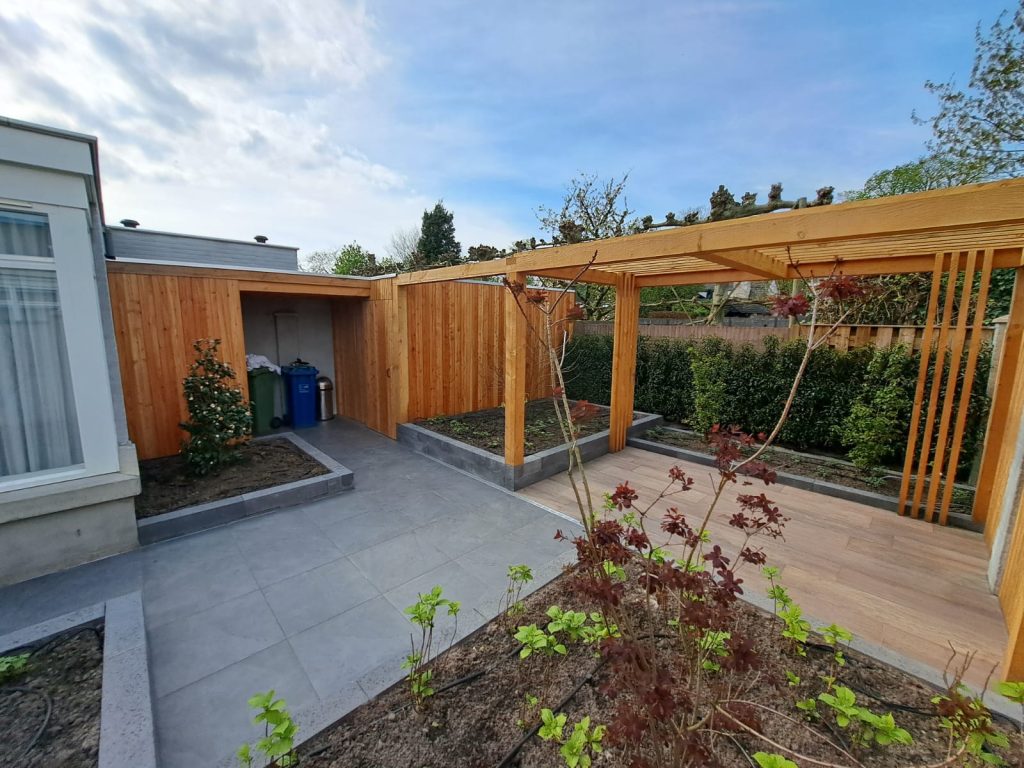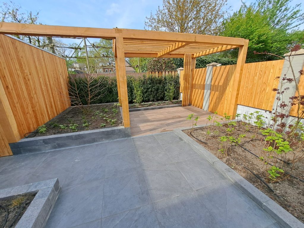 In Heeze hebben we onderstaande tuin, inclusief pergola, keramisch terras en berging, aan mogen leggen
